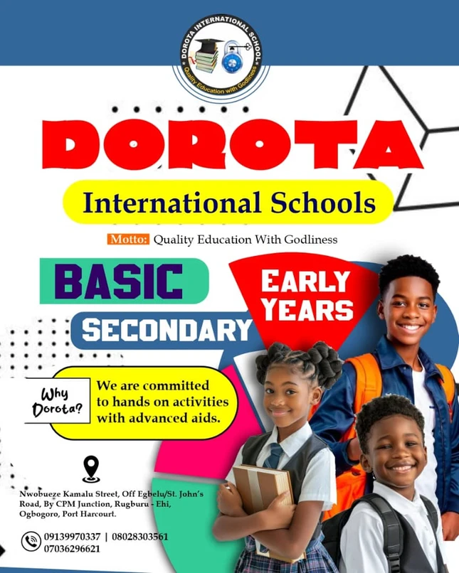 Located in the heart of Port Harcourt, Dorota International Schools provides a nurturing and enriching educational environment. Our mission is to foster a love for learning while instilling strong Christian values. We believe in nurturing the whole child, offering a dynamic curriculum that balances academic excellence with character development. Our dedicated faculty is committed to preparing students to become compassionate and knowledgeable leaders for the future. We are dedicated to providing quality education with godliness.
